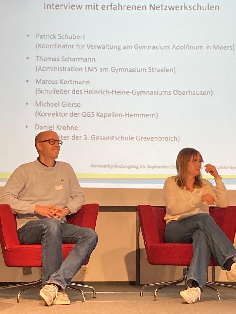Im Wilhelm-Dörpfeld-Gymnasium der Stadt Wuppertal nahmen fast 200 Lehrkräfte aus verschiedenen Schulformen am Netzwerkgründungstag teil. Nach der Begrüßung hatten unsere Grundschule und die 3. Gesamtschule die Gelegenheit in einem Interviewformat von unserer Kooperation zu berichten und die ersten Erfahrungen aus der letztjährigen Pilotphase, bei der erstmals GrundschülerInnen mit Kindern der Klasse 5 zusammenarbeiteten, vorzustellen.