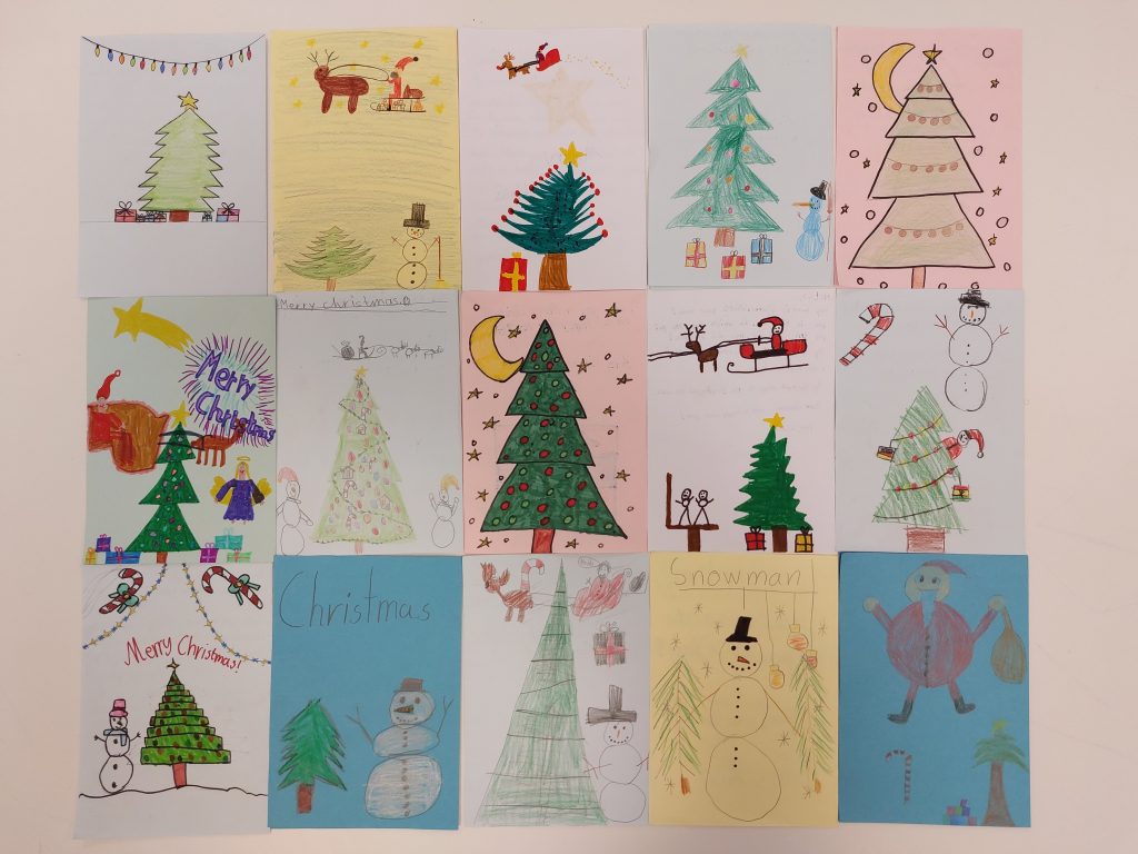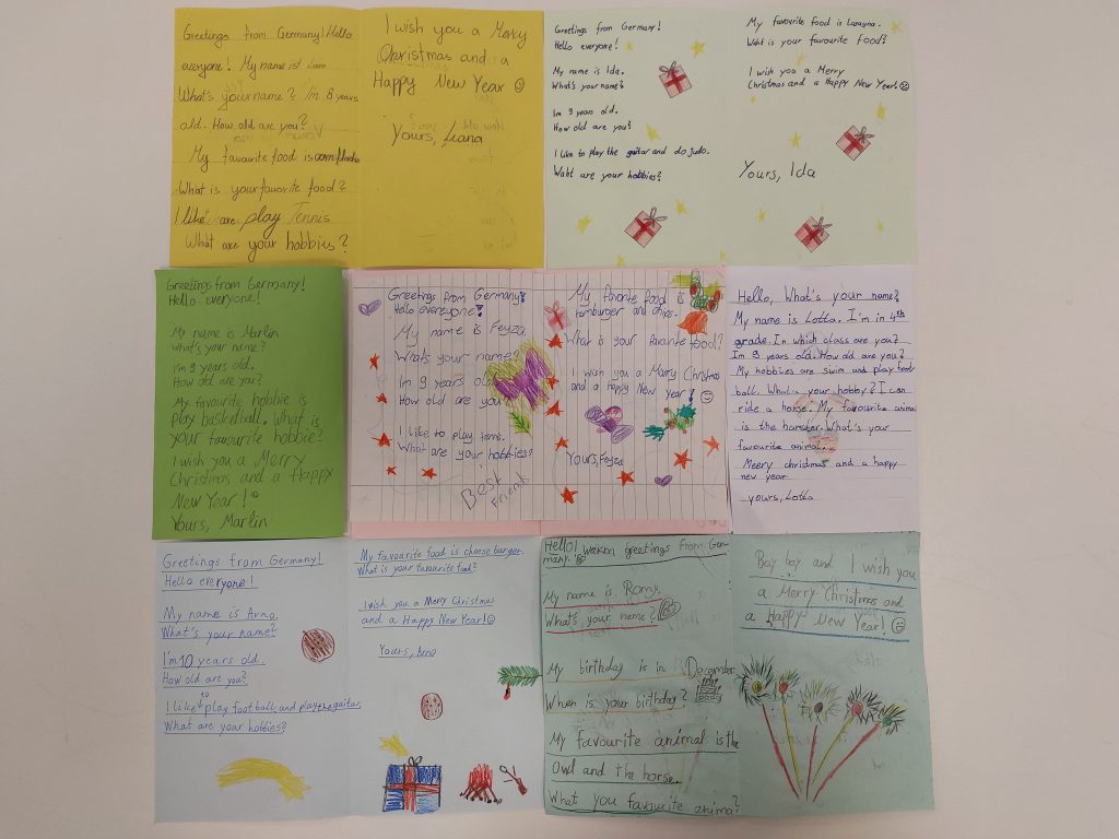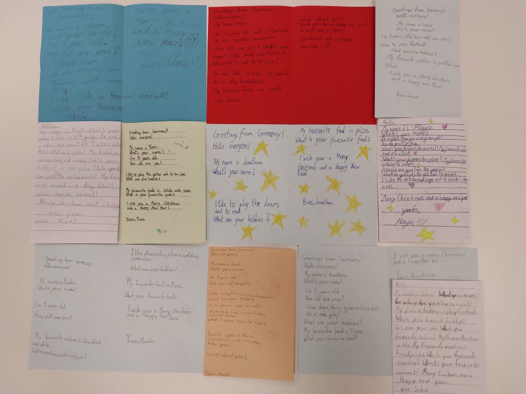 Die Schüler der Klassen 4a, 4b, 4c, 4d und 4e aus Kapellen und Hemmerden haben auch in diesem Jahr im Englischunterricht mit großer Freude und Motivation Weihnachtskarten für unsere Partnerschule in Ghana gebastelt. Verziert wurden die Karten mit wunderschönen Weihnachtsmotiven und liebevollen Freundschaftsmotiven; beschriftet wurden sie selbstverständlich in englischer Sprache.
