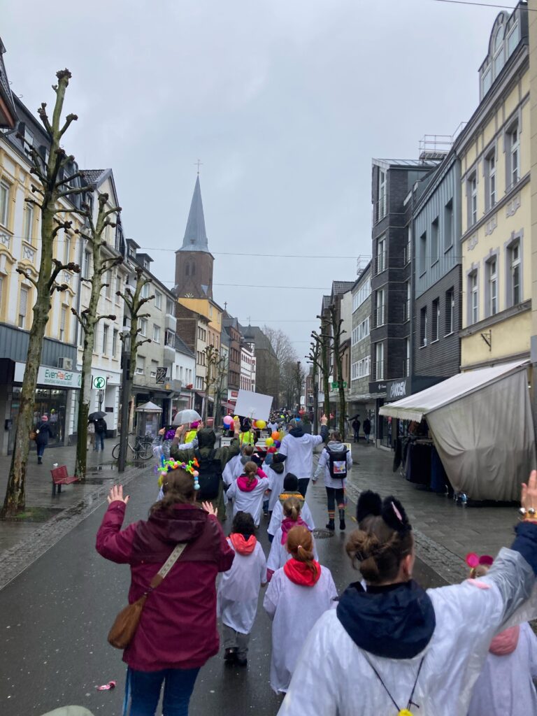 Unter dem Motto „ Karnevalsmaus“ haben sich alle Kinder, Lehrerinnen und Lehrer sowie viele weitere Mitarbeiterinnen und Mitarbeiter auf den Weg in die Grevenbroicher Innenstadt gemacht. Zuvor wurden individuelle Karnevalsmaus-Kostüme gestaltet, die an diesem Tag bunt und fröhlich präsentiert wurden.